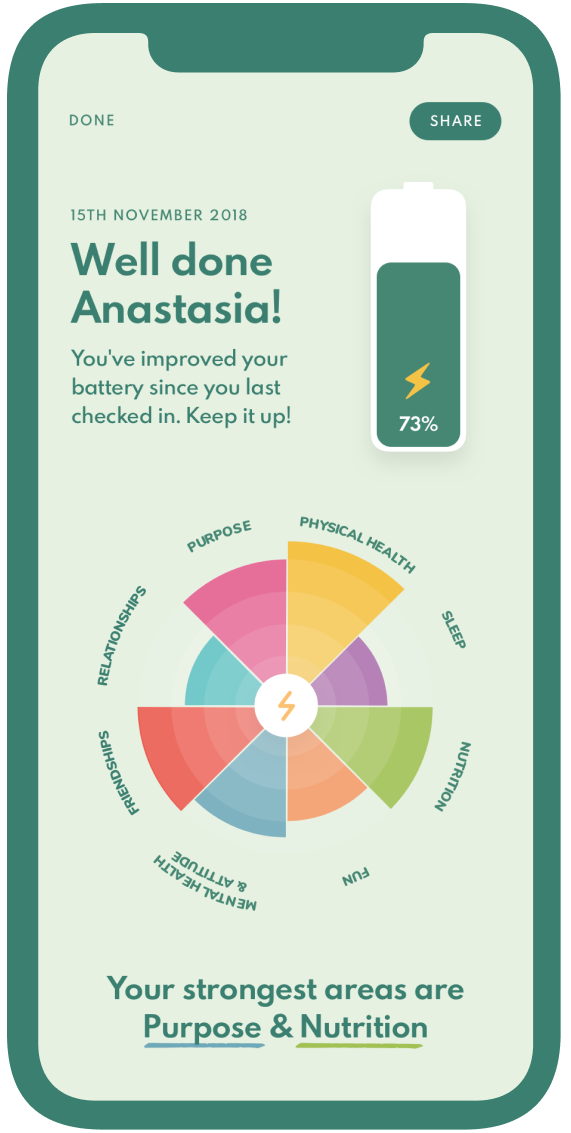 At the core of our method is a ‘battery check’; a way to measure your company’s overall wellbeing and vitality. The battery score of your employees has a direct correlation to how they are feeling and performing at work. Each week your team can take a 60 second self assessment to help them understand how they can go from “survive to thrive”.